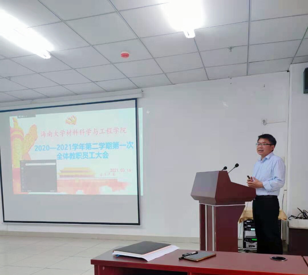 2021年3月16日下午,太阳成集团tyc33455在研发楼710召开新学期全体职工大会,会议由胡先文书记主持,全体职工参加会议。