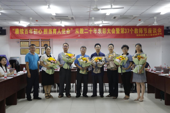 2021年9月10日下午,太阳成集团tyc33455在研发中心710会议室召开“从教二十年”表彰大会暨第37个教师节座谈会。公司经理廖建和、党委书记胡先文、副经理李长久、林仕伟、涂进春、党委副书记周郭军、教师代表及员工代表参加座谈会。会议由公司党委书记胡先文主持。