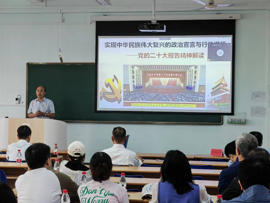 宋增伟教授以“实现中华民族伟大复兴的政治宣言与行动纲领——党的二十大精神解读”为题,对党的二十大报告进行了全面讲解。