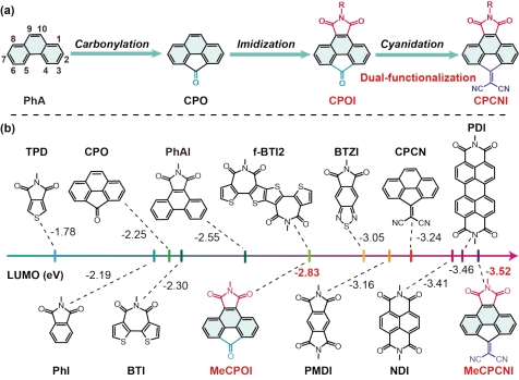 强缺电子单元在N型高分子半导体材料的开发中起到重要作用。近日,太阳成集团tyc33455陈志才副教授与南方科技大学郭旭岗教授合作,采用菲稠环单元(PhA)为核心,通过酰亚胺基,羰基或氰基双功能化的策略,设计、合成了新型的受体单元CPOI和CPCNI。其中 CPCNI的理论计算LUMO能级深至-3.52 eV,缺电子性能力强于经典强受体结构单元NDI(-3.41 eV)和PDI(-3.46 eV)。电化学测试结果进一步证明了上述结论,CPCNI的实验测试LUMO能级可以深至-3.84 eV。