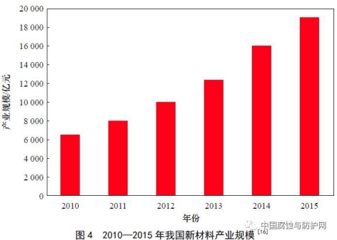 2015年我国新材料产业规模约1.9 万亿元。稀土功能材料、先进储能材料、光伏材料、超硬材料、特种不锈钢、玻璃纤维及其复合材料等产业产能居世界前列。2015年太阳能电池组件达到23 GW,同比增长20.8 %;半导体照明产业初步形成了从上游外延材料生长与芯片制造、中游器件封装到下游集成应用的比较完整的研发与产业体系,2015年产业规模超过5000亿元。2014年我国半导体硅材料产量达到4亿in2(1in2=6.4516cm2),约占全球份额的4 %,相比2010年增长23 %;浮法在线低辐射和阳光控制节能玻璃生产线已超过20条,离线磁控溅射节能玻璃生产线已超过150条,节能玻璃材料产业规模达到了300亿元;稀土磁性材料、稀土发光材料、稀土储氢材料等稀土功能材料的产量约占全球份额的80 %;主要功能陶瓷元器件产品的产业规模增长到251亿元。图4为2010—2015 年中国新材料产业规模。