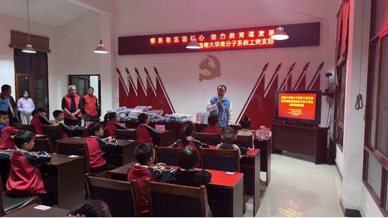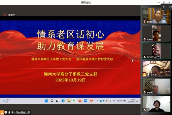 2022年10月19日,材料科学与工程公司高分子系教工党支部与广西壮族自治区全州县(湘江战役所在地)咸水镇白竹村党支部结对共建,通过线上线下相结合的形式开展了以“情系老区话初心,助力教育谋发展”为主题的助学捐赠暨白竹村小员工知识竞赛活动。